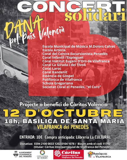 Càritas Interparroquial de Vilafranca, juntament amb les corals de Vilafranca, organitza un concert solidari d’ajuda a les persones afectades per la DANA al País Valencià. Han passat els mesos i encara hi ha moltes persones afectades que necessiten ajuda i aquesta no arriba. Per això hem pensat en fer aquest concert solidari per ajudar els afectats. L’ajuda es canalitzarà a través de Càritas València, que des del primer moment ha estat treballant al costat dels afectats i encara hi és present realitzant diversos projectes d’ajuda a les víctimes. El concert serà el diumenge dia 12 d’octubre de 2025, a les 18:00 h. a la basílica de Santa Maria. Hi participaran: Consort de flautes de bec de l’Escola Municipal de Musica M. Dolors Calvet; Escola Artèria; Coral del Centre Excursionista; Coral Infantil l’Espinguet; Coral Institut Eugeni d’Ors; Coral la Girada i el Tívoli; Coral Laroc; Coral Kandenit; Essència de Gospel; Polifònica; Schola Gregoriana; Societat Coral el Penedès. El preu de l’entrada serà de 10,00€. Hi haurà venda anticipada a la llibreria La Cultural (carrer Sant Joan); també es podran adquirir el mateix dia del concert. Les persones que desitgin col·laborar amb un donatiu o no puguin assistir al concert, poden fer un ingrés al compte de Càritas ES94 2100 0033 1202 0104 1078, o bé al Bizum 11792, també a nom de Càritas Interparroquial de Vilafranca.